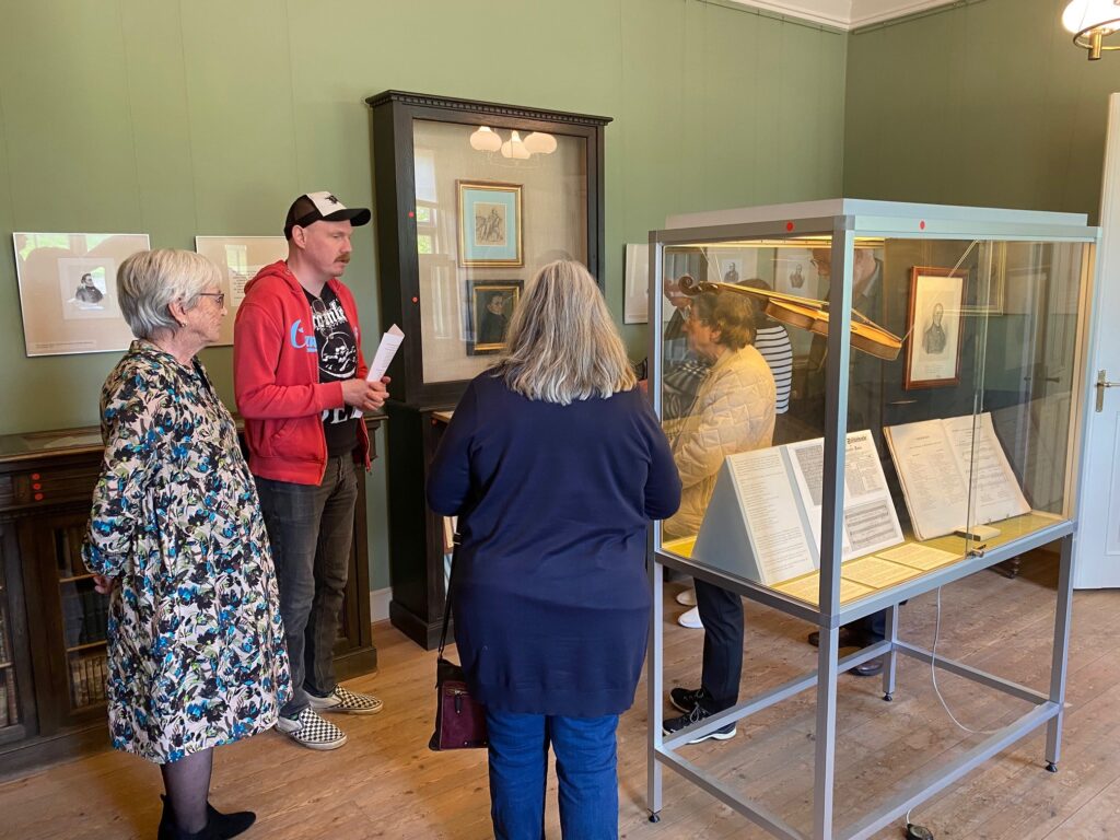Efter Ulla Thyrrings meget spændende foredrag om herregården og om Blicher-samlingen, tog Jesper Meyer Christensen, samlingsinspektør på Museum Midtjylland, os med på en rundvisning i Blicher-udstillingen, hvor vi så bl.a. Blichers originale manuskript til Jyden og ikke mindst H.C. Andersens udkast til Jylland mellem tvende have.